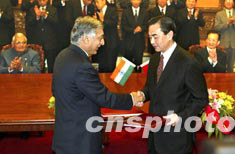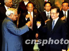中印雙方二十三日在北京簽署有關簡化簽證手續的諒解備忘錄等九個文件,中國國務院總理溫家寶與印度總理瓦杰帕伊舉杯祝賀。中新社記者:鄭萍萍