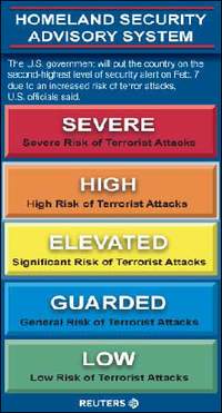 “9-11”后,美國啟用了5種警戒級別,由低到高分為綠、藍、黃、橙、紅。(徐冰川/聞新芳)