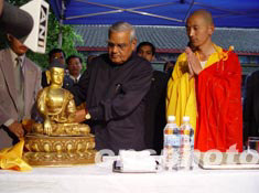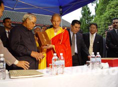 印度總理瓦杰帕伊二十五日參觀位于河南洛陽的“中國第一古剎”白馬寺,向白馬寺贈送銅制鍍金釋迦牟尼佛像。作者:何曉聰