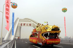 中新網(wǎng)6月28日電 世界上跨度最大的鋼拱橋——上海盧浦大橋,二十八日上午正式建成通車,小巨人姚明帶領(lǐng)千名中外長跑愛好者參加了主題為“活力上海,奔向未來”跨橋長跑活動(dòng)。