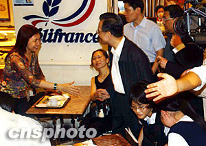 六月三十日,國務院總理溫家寶在香港新城市廣場參觀,圖為他在快餐店與市民交談。中新社記者 潘索菲 攝