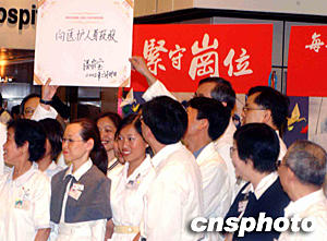 國(guó)務(wù)院總理溫家寶,三十日到首先爆發(fā)非典型肺炎的沙田威爾斯親王醫(yī)院探訪,溫家寶對(duì)于因?yàn)橥炀炔∪诵悦鵂奚尼t(yī)護(hù)人員,他銘記于心 。并即場(chǎng)寫上「向醫(yī)護(hù)人員致敬」的題字。中新社記者 錢興強(qiáng) 攝