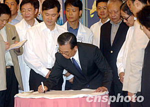 訪港的國(guó)務(wù)院總理溫家寶,六月三十日視察沙田威爾斯親王醫(yī)院,并即場(chǎng)寫上「向醫(yī)護(hù)人員致敬」的題字。中新社記者 錢興強(qiáng) 攝