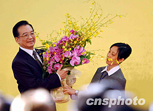 國務院總理溫家寶6月30日在香港出席表揚醫護人員成功抗炎大會時,接受醫護人員獻花,總理溫家寶隨即將花轉送在抗擊SARS中殉職的醫護人員家屬時,受到在場人士的陣陣掌聲。洪少葵 攝