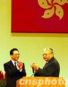 溫家寶說∶今天是香港回歸祖國六周年的喜慶日子。在香港萬眾一心戰勝SARS、奮力重振經濟的重要時刻,我代表中央政府和全國各族人民,向香港特別行政區政府、香港同胞和各界人士表示熱烈祝賀和良好祝愿。