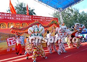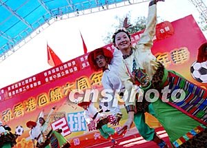 為慶祝香港回歸祖國六周年,香港十個團體合作籌辦的“慶祝回歸祖國六周年足球嘉年華”一連三天在維園舉行。圖為7月1日典禮儀式上龍獅起舞,歡慶佳節。洪少葵 攝