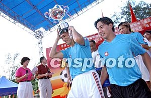 在香港慶祝回歸祖國六周年足球嘉年華比賽中,獲得冠軍的香港漁民互助社足球隊興高彩烈上臺領獎。洪少葵 攝