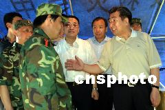 七月五日,國務院副總理回良玉到達安徽阜陽王家壩,慰問在大堤上奮戰(zhàn)抗洪的官兵。中新社 盛佳鵬 攝