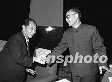 中國著名軍事家張愛萍上將,因病于七月五日二十時三十五分在北京逝世,享年九十三歲。圖為1984年4月30日晚,張愛萍(右)與胡耀邦在北京人民大會堂出席國防科工委慶祝試驗通信衛星發射成功大會上親切握手。作者:鄭瑞德