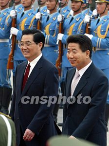 中國國家主席胡錦濤七日在北京舉行儀式歡迎韓國總統盧武鉉訪華。中新社記者:滿會喬
