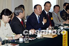 2008年北京奧運(yùn)會(huì)組委會(huì)副主席蔣效愚7月8日在北京會(huì)見以馮滬祥(右一)為團(tuán)長(zhǎng)、郭俊次(右三)為名譽(yù)團(tuán)長(zhǎng)的臺(tái)灣中華教授協(xié)會(huì)大陸參訪團(tuán)成員,并向他們介紹申奧過(guò)程和二零零八年北京奧運(yùn)會(huì)的準(zhǔn)備情況。中新社記者:毛建軍
