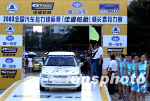 因受“非典”影響而推遲的中國汽車拉力賽第二站比賽15日晚移師吉林省長春市,來自全國的56輛賽車參加本次比賽,吉林省省長洪虎為北京慶洋車隊著名車手任志國揮旗發車。中新社記者:趙振清