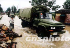 解放軍南京軍區(qū)急調(diào)軍車,向七月中旬淮河行洪區(qū)的安徽省阜陽地區(qū)運送救災(zāi)品。當(dāng)?shù)剞r(nóng)村到處是內(nèi)澇洪水,車隊涉水直奔災(zāi)區(qū)。作者:閆宏宇