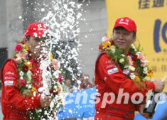 2003年中國汽車拉力賽長春站比賽經過兩天的激烈爭奪17日全部結束,來自北京慶洋車隊的任志國(右)、和領行員潘劍獲得N2組比賽冠軍。中新社記者:趙振清