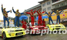 2003年中國汽車拉力賽長春站比賽17日全部結束,云南紅河車隊劉斌、貴州咳速停車隊魏紅杰、黃油坤獲N組比賽前三名。中新社記者:趙振清