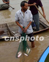 今夏淮河洪水淹沒千里漁米之鄉的魚塘,養魚農民血本無歸。安徽省阜陽縣王家壩的漁民和村民目前抓緊撒網捕撈流失之魚,略補生活損失。中新社記者:賈國榮