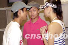 歌星黃伊汶、梁奕倫、范振鋒(右起)7月18日出席香港電臺節(jié)目《娛樂滿天星》訪問,三人同屬環(huán)球唱片公司,節(jié)目未開始時聚首交頭接耳了解事情最新動態(tài)。中新社記者:鄧慶樂