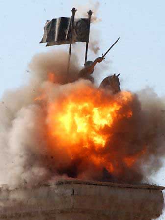 中新網7月19日電 截至7月18日,美軍占領伊拉克首都巴格達已有100天。當天,薩達姆老家提克里特的一座薩達姆雕像又被“推翻”。美軍在拆除這座雕像的過程中使用了炸藥。圖為拆除雕像的現場。(春風)