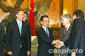 布萊爾表示完全贊同溫家寶對兩國關系的積極評價和對進一步加強雙邊互利合作提出的建議。他說,英中之間有著廣泛的共同利益,在維護世界穩定、促進發展方面也有著共同的期待和追求。英方愿與中方攜手努力,不斷加強兩國在政治、經貿、教育、文化等各領域的合作。