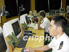 今年第八號強熱帶風暴“天鵝”預計二十一日傍晚在海南到湛江一線沿海登陸,湛江海事局交管中心工作人員利用先進的船舶交管系統(tǒng)(VTS)指揮船舶做好防風準備。作者:潘文