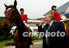 出席亞歐經濟高層論壇的美中貿易發展協會主席羅潔民先生,二十二日游覽大連時向美麗的女騎警致意。中新社記者:鄭萍萍