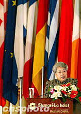 中國國務院副總理吳儀七月二十四日在大連出席第五屆亞歐經濟部長會議開幕式。中新社記者:鄭萍萍