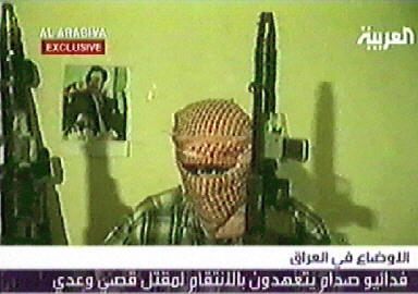 總部設在迪拜的阿拉比亞電視臺24日播出的一盤錄像帶畫面顯示,一群自稱“薩達姆敢死隊”成員的戴著面具、持槍男子發誓要發動更多針對美軍襲擊,為薩達姆的兒子烏代和庫賽復仇。