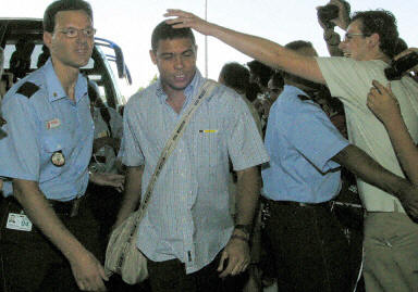 大批球迷到馬德里機(jī)場(chǎng)歡送皇馬亞洲之旅。羅納爾多受球迷“偷襲”。