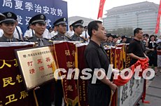 北京警方二十七日舉行“夏季治安攻勢追繳物品發還儀式”,部分被盜汽車失主取回汽車后向警方贈送錦旗。中新社記者:任海霞