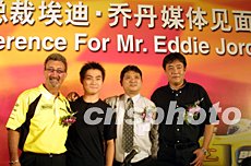 二十九日,喬丹車隊總裁埃迪·喬丹在上海出席媒體見面會,表示喬丹車隊有信心獲得F1上海站的冠軍。圖為埃迪·喬丹在見面會上與中國車手江騰一(左二)等合影留念。作者:湯彥俊