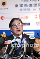 香港足球總會(huì)會(huì)長(zhǎng)霍震霆7月30日主持記者會(huì),公布足球勁旅皇家馬德里8月8日對(duì)香港足球隊(duì)的比賽詳情。作者:洪少葵