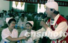 八月五日,由中國文聯組聯部、團中央辦公廳、中國民間文藝家協會等多家單位聯合主辦的健之素“全民抗非典”故事會為中鐵建總醫院的醫生們送上了一場演出,此次故事會將在北京進行約二十場義演。圖為有“陜北民歌大王”之稱的賀玉堂為醫生、護士們演唱陜北民歌。作者:盛佳鵬