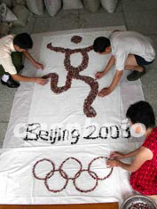 江蘇南京雨花石收藏家曹萍用兩天時間,從十萬枚雨花石中精選出直徑二至三公分的二00八枚精品雨花石,制作了一幅長二點五米、寬一點八米的北京奧運會徽,以表達祝愿北京奧運會成功舉辦的美好心愿。作者:陳旻