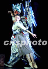 中國中央芭蕾舞團新版《大紅燈籠高高掛》夢幻舞中的女學生熱戀京劇武生趙子龍的夢幻雙人舞,音樂和編舞更具浪漫情結。中新社記者:賈國榮
