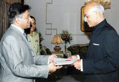 8月9日,印度新任命的駐巴基斯坦高級專員(大使)西夫·沙恩卡爾·梅農(nóng)(右)向巴基斯坦總統(tǒng)穆沙拉夫遞交了國書。此前,在印度首都新德里也舉行了同樣的儀式。這標志著印巴兩國正式全面恢復外交關系。