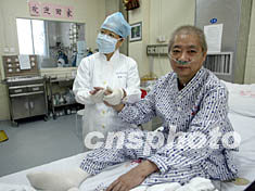 4月18日因參與治療SARS患者而感染的北京人民醫(yī)院檢驗(yàn)科細(xì)菌學(xué)專家王賀,經(jīng)過多家醫(yī)院搶救治療已經(jīng)奇跡般康復(fù)。8月12日,氣色頗佳的王賀在人民醫(yī)院康復(fù)病房接受按摩治療。王賀是做了氣管切開插管手術(shù)的北京SARS患者中,僅存活的四名患者之一。中新社記者:任晨鳴