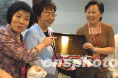 江西與澳門婦女代表成為聯誼“姊妹團”,澳門婦女聯合會副會長賀定一(左二)與江西婦聯主席李亞平(右一)互贈禮品。江西代表團贈送文房四寶祝愿澳門婦聯書寫濃墨重彩的新篇章。中新社記者:廖文靜