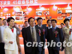 中央電視臺建臺四十五周年發展成就展八月二十九日在北京軍事博物館開幕。圖為中國廣播電影電視總局局長徐光春和嘉賓參觀展覽。中新社記者:杜洋