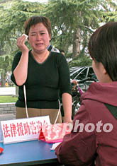 8月31日,鄭州市一位因經濟困難而沒有委托訴訟代理人的女性在接受免費的法律服務。當日鄭州市許多法律援助中心走上街頭,宣傳將于9月1日實施的《法律援助條例》,并為求助的人員提供免費的法律幫助。作者:慎重