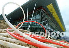正在四川省松潘縣川主寺修建安裝的九寨黃龍旅游機(jī)場候機(jī)樓,為中國高原的現(xiàn)代化航空港,將于九月二十八日通航使用。它可停靠五架飛機(jī),滿足年六十萬人次的旅客流量。中新社記者:賈國榮