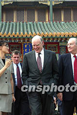 中國國務院總理溫家寶九月三日下午在北京中南海紫光閣會見到訪的美國財政部長斯諾。會見后,斯諾在美國駐華大使雷德的陪同下,笑逐顏開地走出紫光閣。中新社記者:毛建軍