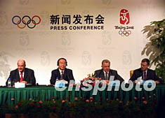北京奧組委和第二十九屆奧運會協調委員會四日在北京聯合舉辦新聞發布會。圖為第二十九屆奧運會協調委員會副主席高斯帕(左一)、北京奧組委副主席蔣效愚(左二)、協調委員會主席海因-維爾布魯根(右二)、國際奧委會奧運會執行主任費利(右一)在新聞發布會上。作者:張勤