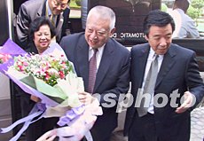 專程到廈門出席第七屆中國投洽會的香港特別行政區行政長官董建華(圖中)一行,七日下午抵達下榻的廈門悅華酒店,受到福建省省長盧展工(右一)及福建省、廈門市有關政府官員的熱情迎接。中新社記者:劉可耕