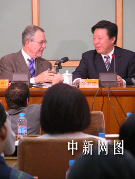 中國文化部部長孫家正(右)與法國駐華大使藍峰。中新社 余瑞冬攝