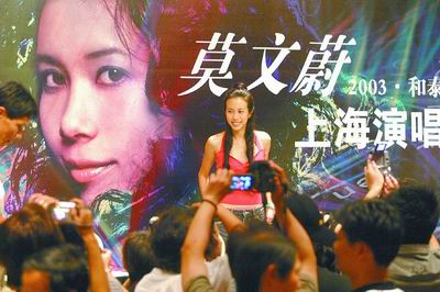 據(jù)文匯報(bào)報(bào)道,昨天,在上海國際會(huì)議中心召開的“2003·和泰玫瑰情莫文蔚上海演唱會(huì)”新聞發(fā)布會(huì)上,莫文蔚以桃紅色露背吊帶裝和刺繡低腰仔褲示人,“熱辣”形象“謀殺”了眾多老記的大把菲林。