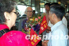 臺灣著名詩人余光中伉儷9月16日下午抵廈門機場,受到鄉親的熱烈歡迎。。余光中的祖籍在泉州市永春縣,這是他第一次“原鄉行”。作者:鄭祚聲