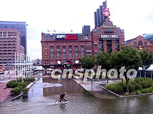 九月,“伊莎貝爾”颶風帶來的強暴雨和大風浪,令美國東部一些沿海城市積澇成災。馬里蘭最大海濱城市巴爾的摩的旅游景點內灣地區一片澤國,騎車人涉水而行。中新社記者:余東暉