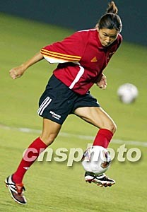 美國當地時間9月19日晚,參加2003女足世界杯的中國女足在美國洛杉磯南部小城卡進行適應場地的熱身訓練。圖為孫雯在訓練中苦練射門。作者:劉占坤
