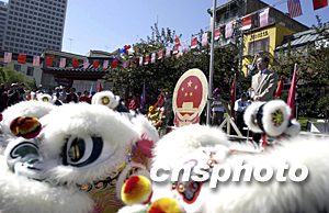 舊金山華僑華人慶祝中國國慶委員會九月二十日在華埠舉行升五星紅旗慶中國國慶儀式,中國駐舊金山總領事王云翔參加升旗儀式。作者:陳鋼
