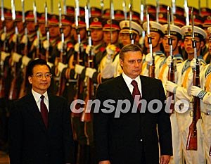 中新網9月24日電 國務院總理溫家寶今天上午在人民大會堂北大廳主持儀式,歡迎出席完上海合作組織成員國總理第二次會晤的俄羅斯聯邦政府總理卡西亞諾夫正式訪華。